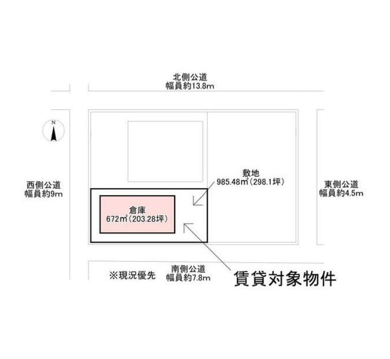 | 構造 | S造(鉄骨造) | 用途 / 面積 | 倉庫 / 672m2(203.28坪) | ||||